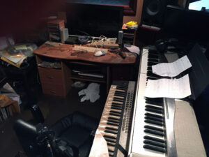 El estudio renació en un cuarto de mi casa, esta vez bajo el nombre Producciones Naranja. Era un lugar improvisado, donde si llovía no podíamos grabar, si los perros ladraban no podíamos grabar… y si pasaba una moto, ya sabes: tampoco.